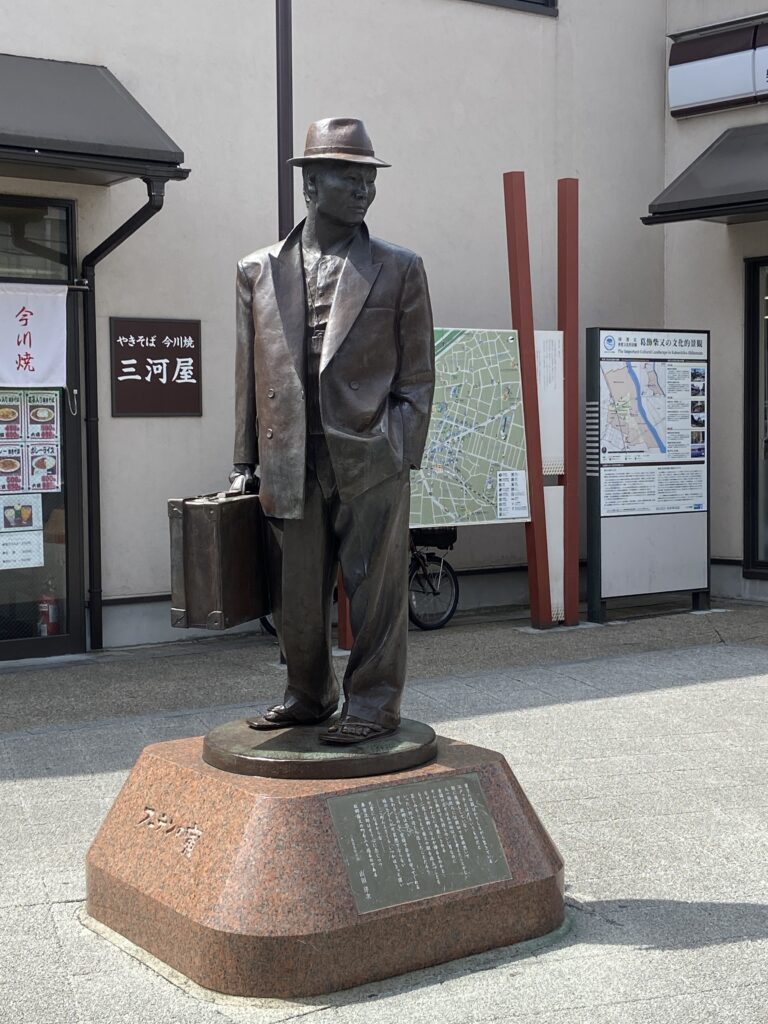 #柴又 に降りると、最初に寅さんの銅像が目に飛び込んでくる。確かに懐かしい姿ですね。すこしピチッとしすぎるかな。その向こうに、あの有名な商店街や帝釈天が続いていた。途中の草団子やさんで「寅さんの撮影の時はどこの店でやっていたのですか」と聞いたら、「ほとんど撮影は映画会社のセットが中心で、このあたりの雰囲気を少しづつ取り入れていたんですよ」との説明でした。この辺での撮影ではなかったのですね。